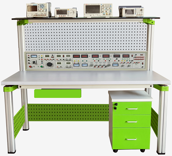 本实训台主要由实训主机箱、仪器架、电源控制箱、独立实训电路模块、实训桌(含磁吸式实训基座)、储存柜、学生凳等组成。