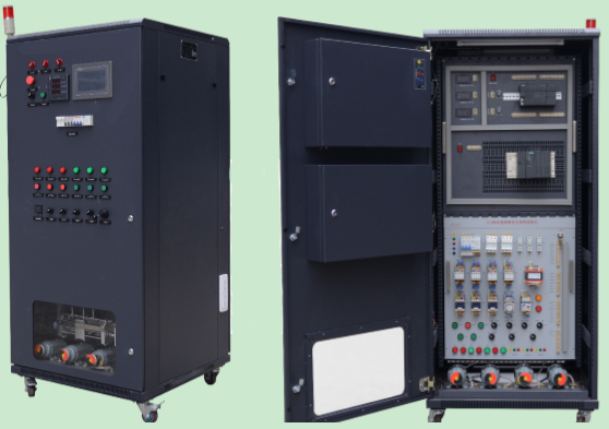 现代电气控制系统安装与调试实训考核装置。是由实训柜体、门板电气控制元件(组件)、仪表等,实训考核单元挂板、网络组态挂板、PLC控制型机床挂板、电机单元、运动单元、温度控制组件、网孔挂板等组成。其外观如图所示。