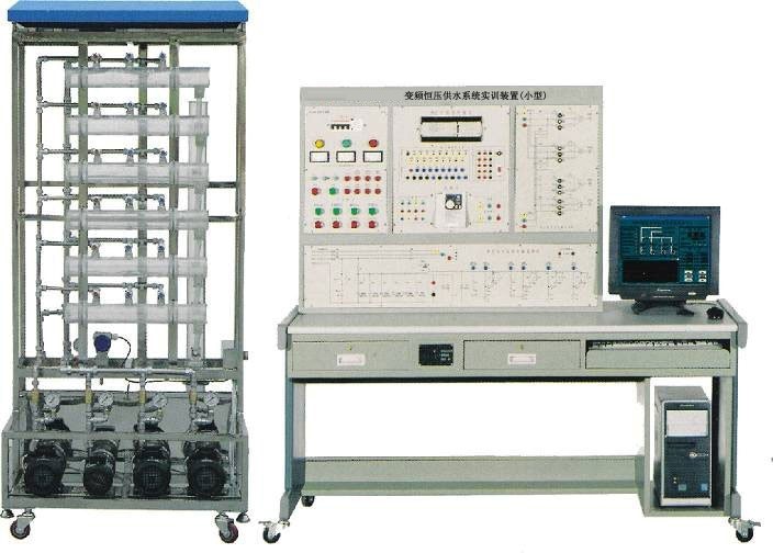 变频恒压供水系统实训装置,集PLC、变频调速、过程控制、工程组态技术于一体。它由六层住宅消防、生活供水系统(实物模型),控制平台两大部分组成,包含了可编程控制器、变频器、变频磁力驱动泵、休眠泵、消防泵、压力变送器、压力仪表、输水管道、消防栓、家用水龙头、蓄水池等工程设备。控制平台采用PLC+变频器的开放式控制结构,可以完成多种模式下的楼层恒压供水实训实训,为教学研究变频恒压供水技术提供一个开放的操作平台。它是一款适合于大学及中、高职院校电气自动化、楼宇自动化、建筑电气、智能建筑等专业的综合型技能实训考核设备。