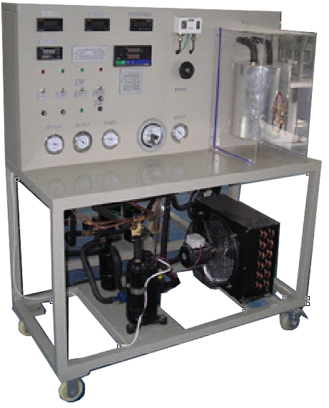 "压缩机性能试验台(电量热计法)"采用蒸汽压缩式制冷循环系统,配备制冷压缩机、不锈钢冷凝器、蒸发器等制冷系统真实部件,并设有彩色控制屏、制冷剂流量调节控制器,电子膨胀阀,涡轮流量计、压力变送器、电压、电流、功率、合相有功功率、各相无功功率、合相无功功率、各相视在功率、合相视在功率、采集器。不但能开设制冷压缩机性能参数的测定实训,还能进行制冷循环基本原理的演示实训。适用于职业院校制冷专业相关课程的教学实训。
