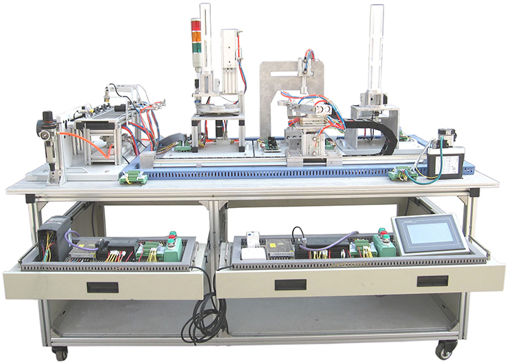 光机电气一体化实训装置由铝合金导轨式实训台、典型的机电一体化设备的机械部件、PLC模块、变频器模块、按钮模块、电源模块、模拟生产设备实训模块、接线端子排和各种传感器、计算机等组成。整体结构采用开放式和拆装式,实训装置用于机械部件组装,可根据现有的机械部件组装生产设备,也可添加机械部件组装其他生产设备,使整个装置能够灵活的按教学或竞赛要求组装具有生产功能的机电一体化设备。模块采用标准结构和抽屉式模块放置架,互换性强;按具有生产性功能和整合学习功能的原则确定模块内容,使教学或竞赛时可方便的选择需要的模块。设备需完全符合电工电子全国职业技能大赛所要求,同时还要求具有可拓展功能,可以组成更加大型的生产模拟系统,以配合各个用户学校不同层次,不同专业的教学及培训要求。