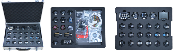 模块包含LED灯模块、按键模块、RGB彩灯模块、蜂鸣器模块、人体感应传感器、光敏传感器、温度传感器、湿度传感器、OLED显示模块、模拟量传感器、直流电机模块、气压传感器模块等十五余种模块、传感器通过4P连接线连接到通用扩展板。