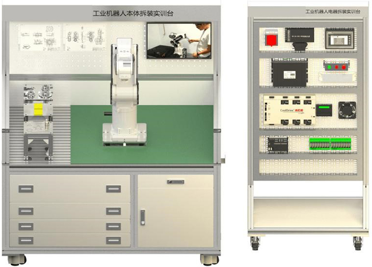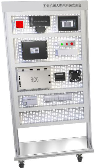 机器人电气维护平台,是把电气柜各大部件拆散安装在网孔架上,清晰体现机器人电气连接原理。让学生可掌握:电气器件认知、电气原理学习、电气故障排除与维护。