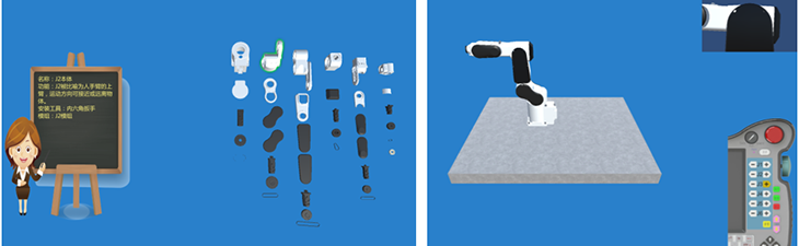 按真实工业机器人1:1开发的虚拟仿真拆装机器人,方便学生在电脑上反复练习而会损坏硬件。三维仿真软件"学、练、考"对由学生自主学习,并自动考核。