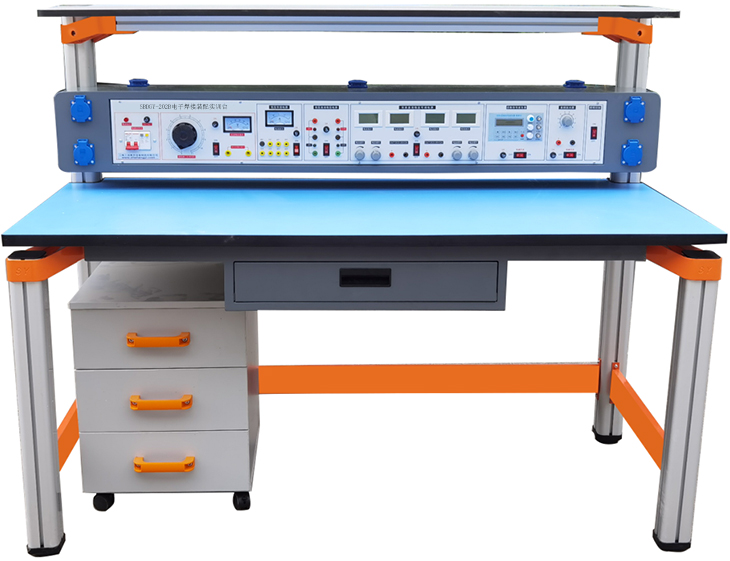 电子焊接装配实训装置由仪器架、主机箱、实验桌、移动矮柜、学生凳等组成。实验装置支架与实验桌可组合、可拆装。支架与桌脚一体,铝合金结构。