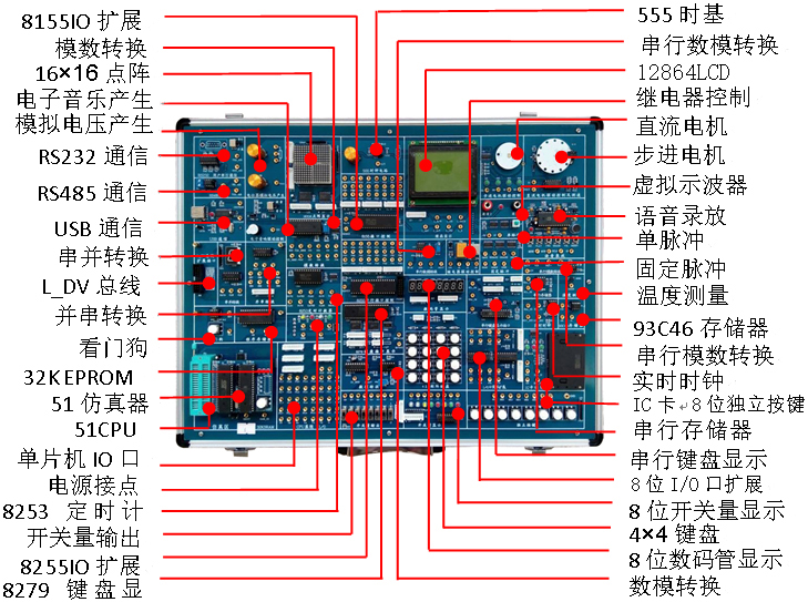 3)实验电路单元应尽可能独立开放,如开放式键盘, 开放式显示器,开放式串口等,为适应多种方式实验提供可能。