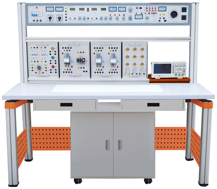 装置由主机箱、实验桌、实训挂箱、独立封装实训电路模块、移动矮柜、示波器架、学生凳等组成。实训装置支架与实训桌可组合、可拆装。支架与桌脚一体,铝合金结构,实训挂箱、各实验模块可根据实验需求自由组合放置。