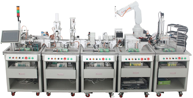 设备涉及工业机器人应用技术、PLC应用技术、触摸屏应用技术、通信应用技术、交流伺服应用技术、交流变频应用技术、电力电子应用技术、传感器应用技术、气动控制技术、机械装调技术等机电一体化知识性能。