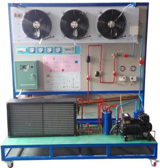 工业制冷系统实训考核装置主要由半封闭式制冷压缩机、冷凝器、蒸发器、膨胀阀和故障设置开关、测试仪表等组成。实训台通过手阀开关和钮子开关分别来设置管路系统和电控系统的 20 多种故障。设备采用先进的电控系统并具有具有开相,缺相, 过流等保护功能。蒸发器风扇采用变频器控制速度。配备 8 路温度计,电压表,电流表,功率表,功率因数表和压力表,能实时观察运行参数