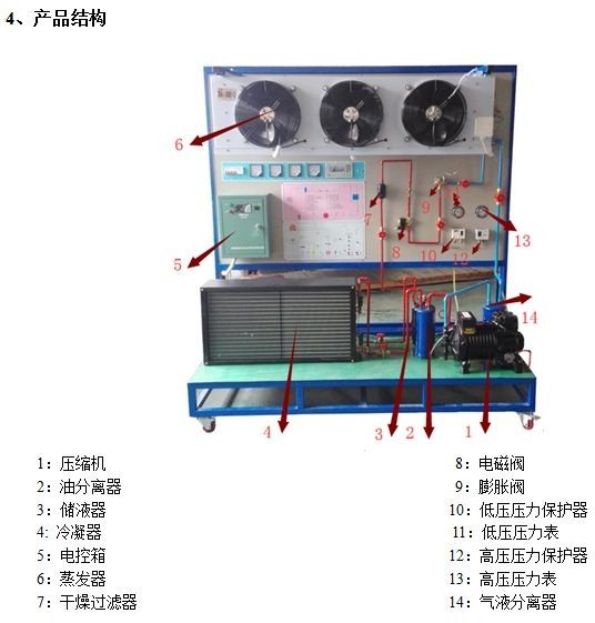 实验台装有压力保护器,防止压力过高或过低对设备造成损坏。制冷系统的高、低压管路,分别涂成红色和蓝色,易于教学而且美观。产品底脚配置 4 个万向轮,可自由移动。