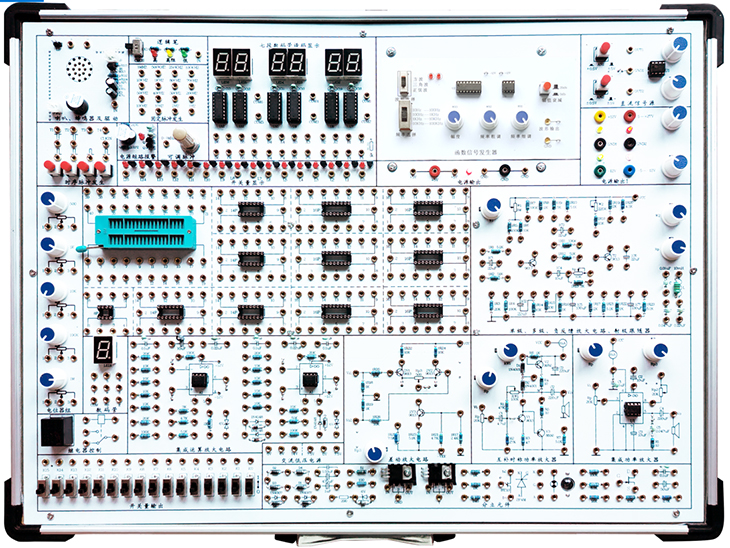 数字/模拟电路实验箱是根据新的教学大纲中确定的教学实验要求为基础,汲取了众多专业教师的教学经验,并综合了众多同类产品的优点而设计的。它函盖了《模拟电子技术基础》及《数字电路基础》课程大部分的实验内容,既为初学者提供了验证性实验电路,又为课程设计提供了扩展平台。