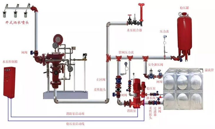 非工作状态下,系统在雨淋阀之后的管道内,有不充气和充满低压气体两种情况,火灾发生时,安装在保护区的感温、感烟火灾探测器首先发出火警信号,控制器在将报警信号作声光显示的同时开启雨淋阀,使水进入管路,并在很短时间内完成充水过程,使系统转变成湿式系统,以后的动作与湿式系统相同。