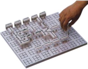实训桌一桌两座,实训桌中央配有通用九孔万能插件板(尺寸:35cm×90cm ),九孔万能插件板主体由ABS注塑而成,表面布有九孔成一组相互联通的插孔,九孔万能插件板内部内嵌126组铜质九孔一体成型嵌件(共有1134孔)。实训中的弱电模块必须以独立封装的透明元件盒为单一模块,元件盒统一都能配合九孔万能插件板像搭积木一样的形式自由搭建组合电路;元件盒盒体透明,内装元件直观性好,盒盖印刷电路图防刮耐磨,符号美观清晰。元件盒盒体与盒盖采用较科学的压卡式结构,维修拆装方便。每张台桌配有一粒胶皮板,保护通用底板与桌面(如需在桌上放置电动机、焊接等)。