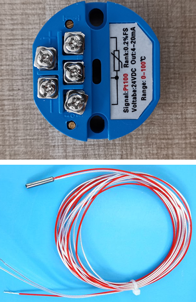 特点:Pt100传感器精度高,热补偿性较好,用于做标准校验用热电阻。变送器部分供电DC24V,输出4-20mA DC通信功能,用于测量加热模块内部的温度,是工业现场中常用的一温度测量仪表。精度为0.5