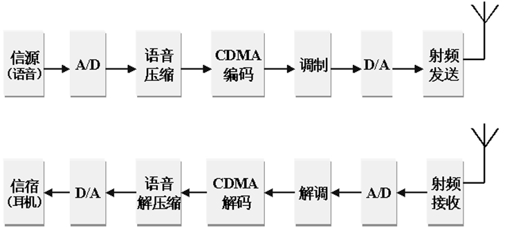 (1)发端:语音数字化、压缩、CDMA编码、调制、上变频、发射……;