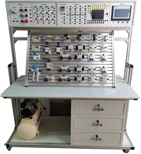 1PLC控制气动实训装置主要由实训桌及实训台、气动元件和电气控制器件、可编程控制器(PLC)等组件组成。
