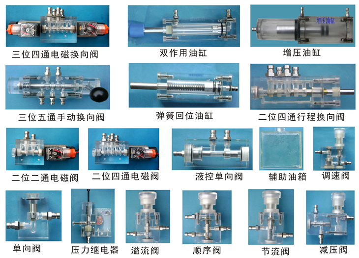 4.配备全常用液压元件:每个液压元件均配有安装底板,可方便、随意地将液压元件安放在铝合金型材面板上(面板带"T"沟槽形式的铝合金型材结构)。油路搭接采用快换接头,拆接方便,不漏油。