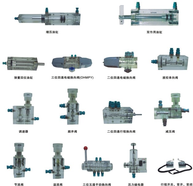4、实验元件均为透明有机材料制成,便于了解掌握几十种常用液压元件的结构,性能及用途。掌握几十种基本回路的工作原理,实验组装回路快捷、方便。